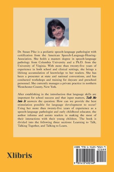 After establishing in the introduction that language skills are important for school success and that input matters, Talk Me Into It answers the question: How can we provide the best stimulation possible for language development to occur? Using her more than twenty-five years of experience as a speech-language pathologist and early childhood educator, the author informs and assists readers in making the most of their interactions with their young children. The book is 240 pages and contains twelve illustrations. Talk Me Into It is divided into three sections. The first section, Learning to Talk, covers specific features of both listening and speaking, that are expected to appear at various stages. Each stage is described in terms of typical behavior, and what can be done to enhance development at that particular stage. The second section, entitled Talking Together, explains general principles and specific strategies that parents can use when talking with their children. It also discusses important differences between activities. The third section, Talking to Learn, provides specific ways to help prepare a child for success as a participant in a classroom, and addresses readiness skills necessary for learning to read and write. The final chapter presents the latest research on dyslexia, identify early warning signs of a language-based learning disability and offers information about where to find advice and help. An appendix of language activities appropriate for preschoolers is followed by a second appendix of resources and organizations with web site addresses. Talk Me Into It offers: I. Top Ten lists of activities for each of five age levels (birth through age six) II. An "Ask Dr. Susan" feature in which questions commonly asked by parents will be addressed III. A down-to-earth practical guide to language development for the lay public IV. Self-Check exercises that parents and caregivers can use to increase their understanding and awareness of how they interact with their child Who This Book Is For: ¿ Parents, ¿ Day Care Providers ¿ Grandparents ¿ Babysitters and Nannies ¿ Preschool and Kindergarten Teachers ¿ Entry level practitioners in: ¿ speech-language pathology ¿ occupational therapy ¿ special and early childhood education Readers of this book will learn: ¿ Which language, motor and play behaviors to expect at different ages ¿ Ways of interacting with children that will stimulate language growth ¿ How language skills are critical to reading readiness and early school success ¿ Fun activities used by a speech-language pathologist to help develop language skills ¿ When it might be wise to consult a speech-language pathologist, and where to get help Table of Contents: Part I: Learning to Talk 1. Infancy: Crying, Cooing, Babbling and First Words 2. Age One to Two: Walking and Talking 3. Age Two to Three: Learning How Words Go Together 4. Age Three to Five: Learning to Have Conversations 5. Age Five to Six: Getting Ready to Become Literate Part II: Talking Together 6. Conversational Strategies: three Ex's and a WHALE 7. So Glad You Asked: Asking Good Questions 8. Activity Matters Part III: Talking to Learn 9. Getting Ready for School: The Preschool Experience 10. Getting Ready to Read and Write: Not as Simple as ABC 11. Ready or Not: Here I Come Appendix A: Language Activities for Preschool (LAP) Appendix B: Resources, Books, Programs, Materials