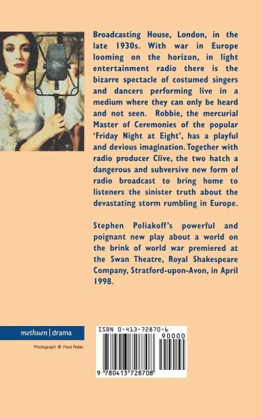 Stephen Poliakoff 'has been one of our sharpest and least predictable writers for the past twenty years' (Daily Telegraph) Broadcasting House, London, in the late 1930s. With war in Europe looming on the horizon, in light entertainment radio there is the bizarre spectacle of costumed singers and dancers performing live in a medium where they can only be heard and not seen. Robbie, the mercurial Master of Ceremonies of the popular 'Friday Night at Eight', has a playful and devious imagination. Together with radio producer Clive the two hatch a dangerous and subversive new form of radio broadcast to bring home to listeners the sinister truth of the devastating storm rumbling in Europe.