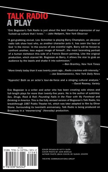 Eric Bogosian’s Talk Radio is just about the best theatrical expression of our fucked-up culture that I know.” -John Hellpern, New York Observer Gut-grabbing the most lacerating portrait of a human meltdown this side of a Francis Bacon painting.” -Ben Brantley, New York Times More timely today than it was twenty years ago Radio crackles with intensity.” -Joe Dziemianowicz, New York Daily News Hypnotic! Both as an actor’s tour-de-force and a stinging cultural analysis.” -David Rooney, Variety This is the fully revised version of Eric Bogosian’s Talk Radio, his breakthrough 1987 Public Theater hit, which was named a finalist for the Pulitzer Prize for Drama, was adapted to film by Oliver Stone, and was revived on Broadway in 2007 in celebration of the play's twentieth anniversary. One of America’s premier performers and most innovative and provocative artists, Eric Bogosian’s plays and solo work include suburbia (Lincoln Center Theater, 1994; adapted to film by director Richard Linklater, 1996); Sex, Drugs, Rock & Roll, Pounding Nails in the Floor with My Forehead; Griller; Humpty Dumpty; 1+1; Skunkweed; Wake Up and Smell the Coffee; Drinking in America; Notes from Underground and Talk Radio (Pulitzer Prize finalist; New York Shakespeare Festival, 1987; Broadway, 2007; adapted to film by director Oliver Stone, 1988). He has starred in a wide variety of film, TV and stage roles. Most recently, he created the character of Captain Danny Ross on the long-running series Law & Order: Criminal Intent . In 2014, TCG published 100 (monologues), a collection that commemorates thirty years of Bogosian’s solo-performance career.