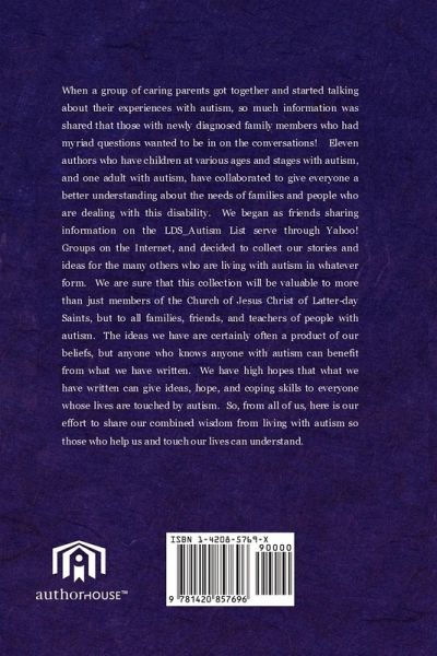 When a group of caring parents got together and start talking about their experiences with autism, so much information was shared that those with newly diagnosed family members who had myriad questions wanted to be in on the conversations! Eleven authors who have children at various ages and stages with autism, and one adult with autism, have collaborated to give everyone a better understanding about the needs of families and people who are dealing with this disability. We began as friends sharing information on the LDS_Autism List serve through Yahoo! Groups on the Internet, and decided to collect our stories and ideas for the many others who are living with autism in whatever form. We are sure that this collection will be valuable to more than just members of the Church of Jesus Christ of Latter-day Saints, but to all families, friends, and teachers of people with autism. The ideas we have are certainly often a product of our beliefs, but anyone who knows anyone with autism can benefit from what we have written. We have high hopes that what we have written can give ideas, hope, and coping skills to everyone whose lives are touched by autism. So, from all of us, here is our effort to share our combined wisdom from living with autism so those who help us and touch our lives can understand.
