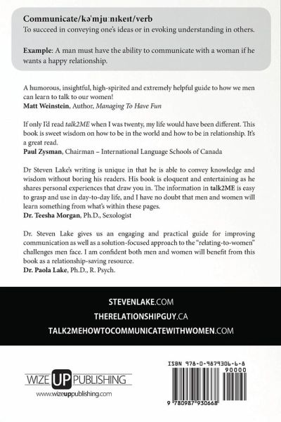talk2ME: How to communicate with women, tune-up your relationship, tone down the fights, dodge divorce, and have sex more than once a year. This book was written so that you can improve your ability to communicate with women and create change in your life. As the title suggests, the goal is to have a better relationship with your partner. When you have a better relationship you will notice that life is smoother, you are happier, and you are getting more and better sex. Does that sound like a goal worth pursuing? This book explains the differences between men and women, how we (men) became the way we are, how the change process works, and how to create a plan that will improve your communication skills with women. Of course, a game plan only works in relationship if you know what you want and what your partner wants. Once you have identified your strengths and weaknesses and figured out what women want around communication, then you are ready to learn the secrets of "advanced" communication. Learning that communication is about conveying information and evoking understanding gives you a head-start for improving your relationship. Building on this foundation, you discover what she really wants and learn to avoid emotional minefields. Furthermore, you will see that winning the argument often leads to harming the relationship and how this destructive habit is a result of our male conditioning. Finally, like any object of your desire (not that you should think of women as objects) ongoing maintenance is a necessity, not an option. In other words, love is not enough. Women want to be respected, appreciated, and shown love in regular and tangible ways. When you are able to communicate effectively and nurture the relationship, you will be amply rewarded.