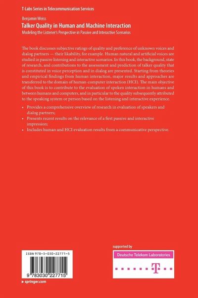 The book discusses subjective ratings of quality and preference of unknown voices and dialog partners - their likability, for example. Human natural and artificial voices are studied in passive listening and interactive scenarios. In this book, the background, state of research, and contributions to the assessment and prediction of talker quality that is constituted in voice perception and in dialog are presented. Starting from theories and empirical findings from human interaction, major results and approaches are transferred to the domain of human-computer interaction (HCI). The main objective of this book is to contribute to the evaluation of spoken interaction in humans and between humans and computers, and in particular to the quality subsequently attributed to the speaking system or person based on the listening and interactive experience.
