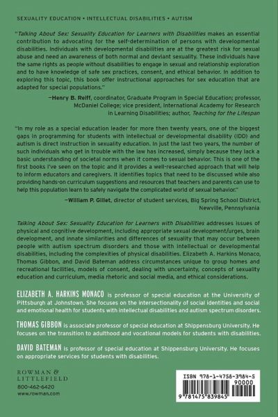 Preface Acknowledgments Chapter 1- Introduction Chapter 2- We're in this Together: Who are the Educators? Chapter 3- The Birds and the Bees: Specific Skills and Teaching Strategies Chapter 4- We Can't Hide: Pop Culture and Digital Media Chapter 5- The Birds and the Bees, Round 2: The Curriculum Chapter 6- No One Can Escape Puberty: Physical and Cognitive Development Chapter 7- What Does It All Mean: LGBTQ+ Chapter 8- Special Considerations: Group Homes and Residential Facilities Chapter 9- Similarities and Differences: ASD and IDD Chapter 10- Just Say No! (Or Yes): Ethics About the Authors