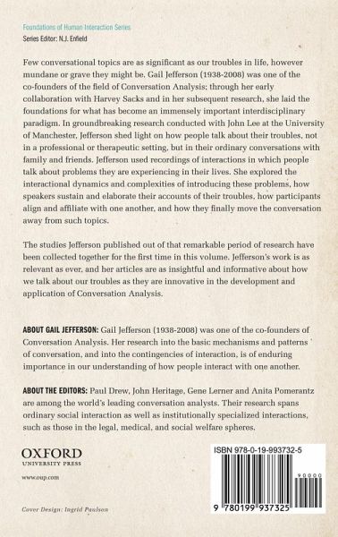 Gail Jefferson (1938-2008) was, with Harvey Sacks and Emanuel Schegloff, one of the co-founders of Conversation Analysis. Through her early collaborative with Sacks, she developed the transcription system that underpins our paradigm. Her research into the basic mechanisms and patterns of conversation, and into the contingencies of interaction, is of enduring importance in our understanding of how people interact with one another. About the editors: Paul Drew, John Heritage, Gene Lerner and Anita Pomerantz are among the world's leading conversation analysts. Their research spans ordinary social interaction as well as interactions in legal, medical, social welfare and other such institutionally specialized interactions - their publications are amongst the most cited in the field. They each worked closely with Gail Jefferson, and have worked on this project closely, in order to bring her work to the attention of new generations of CA researchers and teachers.