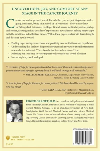 UNCOVER HOPE, JOY, AND COMFORT AT ANY STAGE IN THE CANCER JOURNEY Cancer can rock a person's world. But whether you are just diagnosed, undergoing treatment, being monitored, or in remission-there is now help. In Talking Back to Cancer, Dr. Roger Granet shares medical expertise, poetry, and stories, drawing on four decades of experience as a psychiatrist helping people cope with the emotional side effects of cancer. Within these pages, readers will draw strength and discover a path toward:Finding hope, loving connections, and positivity even amidst fears and trepidation Understanding that the latest diagnostic advances and newer, user-friendly treatments now make the statement, "There is no better time to have cancer," true Releasing any tendency to catastrophize or live under the sword of cancer Nurturing body, soul, and spirit