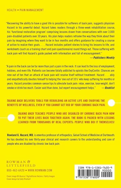 Talking Back teaches people who are disabled by chronic back pain how to put their lives back together again. The book is packed with lessons learned from thousands of real experts: people who did it themselves!