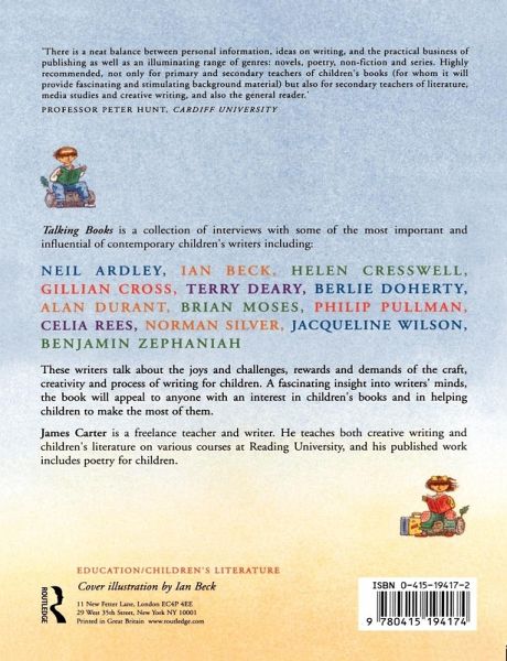 Talking Books sets out to show how some of the leading children's authors of the day respond to these and other similar questions. The authors featured are Neil Ardley, Ian Beck, Helen Cresswell, Gillian Cross, Terry Deary, Berlie Doherty, Alan Durant, Brian Moses, Philip Pullman, Celia Rees, Norman Silver, Jacqueline Wilson, and Benjamin Zephaniah. They discuss with great enthusiasm: *their childhood reading habits *how they came to be published *how they write on a daily basis *how a particular book came together *a type of writing that they are especially known for. Through in-depth interviews, they each reveal their approach to their craft. Much is know and spoken of the product that is the children's book, but it is rare that writers are given the opportunity to talk at length about the process of writing for children. Talking Books redresses the balance by presenting a wide selection of authors (of fiction, non-fiction and poetry) reflecting upon the joys and challenges of the craft, creativity and process of writing for children.