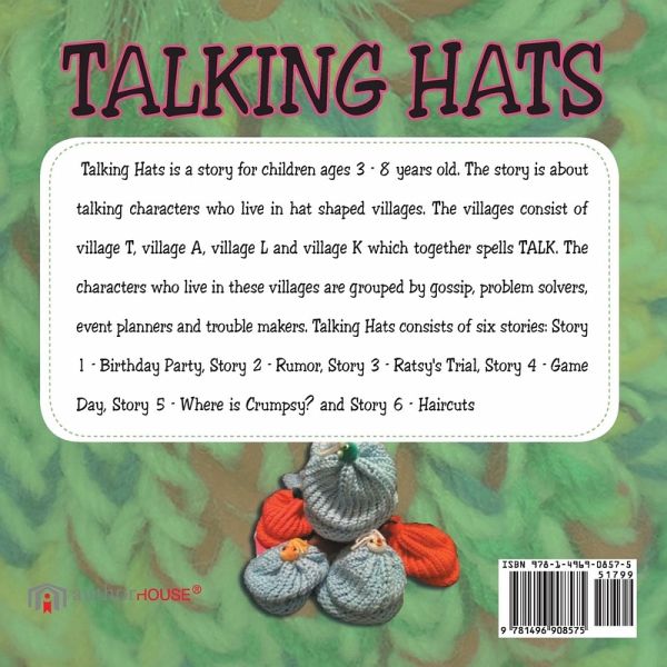 Talking Hats is a story for children ages 3 - 8 years old. The story is about talking characters who live in hat shaped villages. The villages consist of village T, village A, village L and village K which together spells TALK. The characters who live in these villages are grouped by gossip, problem solvers, event planners and trouble makers. Talking Hats consists of six stories: Story 1 - Birthday Party, Story 2 - Rumor, Story 3 - Ratsy's Trial, Story 4 - Game Day, Story 5 - Where is Crumpsy?n and Story 6 - Haircuts