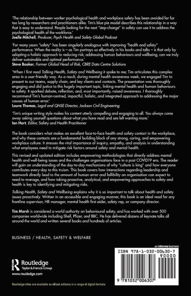 Talking Health, Safety and Wellbeing explains why it is so important to talk about health and safety issues proactively. Written in an accessible and engaging manner, this book is an ideal read for any frontline supervisor, HR manager, mental health first aider, safety rep, or company director.