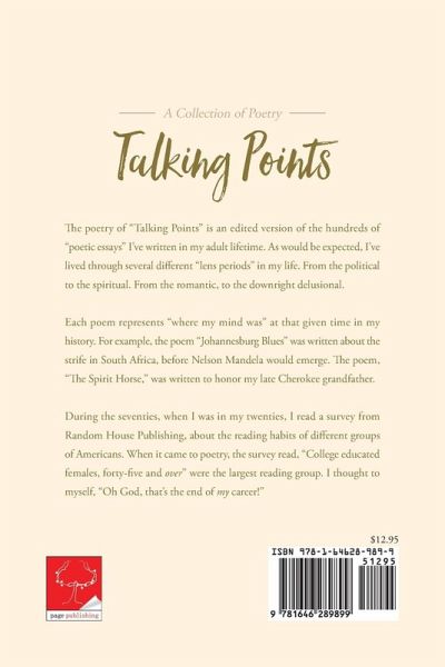 The poetry of "Talking Points" is an edited version of the hundreds of "poetic essays" I've written in my adult lifetime. As would be expected, I've lived through several different "lens periods" in my life. From the political to the spiritual. From the romantic, to the downright delusional. Each poem represents "where my mind was" at that given time in my history. For example, the poem "Johannesburg Blues" was written about the strife in South Africa, before Nelson Mandela would emerge. The poem, "The Spirit Horse," was written to honor my late Cherokee grandfather. During the seventies, when I was in my twenties, I read a survey from Random House Publishing, about the reading habits of different groups of Americans. When it came to poetry, the survey read, "College educated females, forty-five and over" were the largest reading group. I thought to myself, "Oh God, that's the end of my career!"