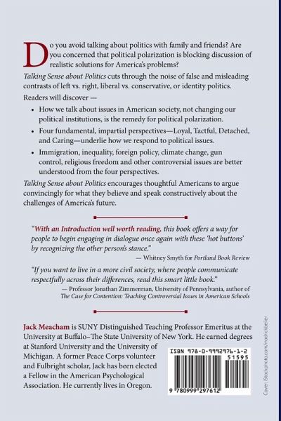Do you avoid talking about politics with family and friends? Are you concerned that political polarization is blocking discussion of realistic solutions for America's problems? Talking Sense about Politics cuts through the noise of false and misleading contrasts of left vs. right, liberal vs. conservative, or identity politics, and explains how American politics is better understood from four perspectives. Readers discover- How we talk about issues in American society, not changing our political institutions, is the remedy for political polarization. Four fundamental, impartial perspectives-Loyal, Tactful, Detached, and Caring-underlie how we respond to political issues. Immigration, inequality, foreign policy, climate change, gun control, religious freedom and other controversial issues are better understood from the four perspectives. Talking Sense about Politics encourages thoughtful Americans to engage in productive conversations, argue openly and convincingly for what they believe, and speak creatively and constructively about the challenges of America's future.