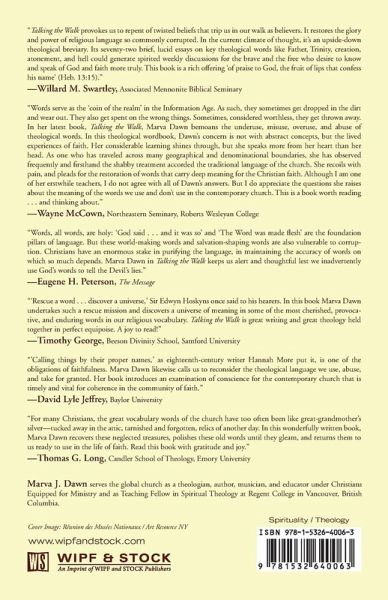 ""Talking the Walk provokes us to repent of twisted beliefs that trip us in our walk as believers. It restores the glory and power of religious language so commonly corrupted. In the current climate of thought, it's an upside-down theological breviary. Its seventy-two brief, lucid essays on key theological words like Father, Trinity, creation, atonement, and hell could generate spirited weekly discussions for the brave and the free who desire to know and speak of God and faith more truly. This book is a rich offering 'of praise to God, the fruit of lips that confess his name' (Heb. 13:15)."" --Willard M. Swartley, Associated Mennonite Biblical Seminary ""Words serve as the 'coin of the realm' in the Information Age. As such, they sometimes get dropped in the dirt and wear out. They also get spent on the wrong things. Sometimes, considered worthless, they get thrown away. In her latest book, Talking the Walk, Marva Dawn bemoans the underuse, misuse, overuse, and abuse of theological words. In this theological wordbook, Dawn's concern is not with abstract concepts, but the lived experiences of faith. Her considerable learning shines through, but she speaks more from her heart than her head. As one who has traveled across many geographical and denominational boundaries, she has observed frequently and firsthand the shabby treatment accorded the traditional language of the church. She recoils with pain, and pleads for the restoration of words that carry deep meaning for the Christian faith. Although I am one of her erstwhile teachers, I do not agree with all of Dawn's answers. But I do appreciate the questions she raises about the meaning of the words we use and don't use in the contemporary church. This is a book worth reading... and thinking about."" --Wayne McCown, Northeastern Seminary, Roberts Wesleyan College ""Words, all words, are holy: 'God said... and it was so' and 'The Word was made flesh' are the foundation pillars of language. But these world-making words and salvation-shaping words are also vulnerable to corruption. Christians have an enormous stake in purifying the language, in maintaining the accuracy of words on which so much depends. Marva Dawn in Talking the Walk keeps us alert and thoughtful lest we inadvertently use God's words to tell the Devil's lies."" --Eugene H. Peterson, The Message ""'Rescue a word...discover a universe,' Sir Edwyn Hoskyns once said to his hearers. In this book Marva Dawn undertakes such a rescue mission and discovers a universe of meaning in some of the most cherished, provocative, and enduring words in our religious vocabulary. Talking the Walk is great writing and great theology held together in perfect equipoise. A joy to read!"" --Timothy George, Beeson Divinity School, Samford University ""'Calling things by their proper names,' as eighteenth-century writer Hannah More put it, is one of the obligations of faithfulness. Marva Dawn likewise calls us to reconsider the theological language we use, abuse, and take for granted. Her book introduces an examination of conscience for the contemporary church that is timely and vital for coherence in the community of faith."" --David Lyle Jeffrey, Baylor University ""For many Christians, the great vocabulary words of the church have too often been like great-grandmother's silver--tucked away in the attic, tarnished and forgotten, relics of another day. In this wonderfully written book, Marva Dawn recovers these neglected treasures, polishes these old words until they gleam, and returns them to us ready to use in the life of faith. Read this book with gratitude and joy."" --Thomas G. Long, Candler School of Theology, Emory University Marva J. Dawn serves the global church as a theologian, author, musician, and educator under Christians Equipped for Ministry and as Teaching Fellow in Spiritual Theology at Regent College in Vancouver, British Columbia.