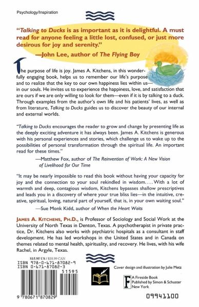 The purpose if life is joy. James A. Kitchens, in this wonderfully engaging book, helps us to remember our life's purpose and to realize that the key to our own happiness lies within us-- in our souls. He invites us to experience the happiness, love, and satisfaction that are ours if we are only willing to look for them-- even if it is by talking to a duck. Through examples from the author's own life and his patients' lives, as well as from literature, "Talking to Ducks" guides us to discover the beauty of our internal and external worlds.
