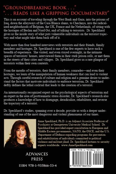 This is an account of traveling through the West Bank and Gaza, into the prisons of Iraq, down the alleyways of the Casablanca slums, to Chechnya, into the radicalized neighborhoods of Belgium, the UK, France and the Netherlands, of sitting with the hostages of Beslan and Nord Ost, and of talking to terrorists. Dr. Speckhard gives us the inside story of what puts vulnerable individuals on the terrorist trajectory and what might take them back off of it. With more than four hundred interviews with terrorists and their friends, family members and hostages, Dr. Speckhard is one of the few experts to have such a breadth of experience. She visited, and even stayed overnight, in the intimate spaces of terrorists' homes, interviewed them in their stark prison cells, or met them in the streets of their cities and villages. Dr. Speckhard gives us a rare glimpse of terrorists within their own contexts. From the mouths of terrorists, their family members, comrades-and even their hostages, we learn of the manipulation of human weakness that can lead to violent acts. Through careful research of culture and religion and a genuine desire to understand the factors that motivate individuals to embrace terrorism, Dr. Speckhard deftly defines the lethal cocktail that leads to the creation of a terrorist. An internationally recognized expert on the psychological aspects of terrorism and an expert in the area of posttraumatic stress disorder, Dr. Speckhard's research also produces a knowledge of how to disengage, deradicalize, rehabilitate, and reverse the trajectory of a terrorist. Dr. Speckhard's studies spanning over a decade provide us with a deeper understanding of one of the most dangerous and violent phenomena of our times.