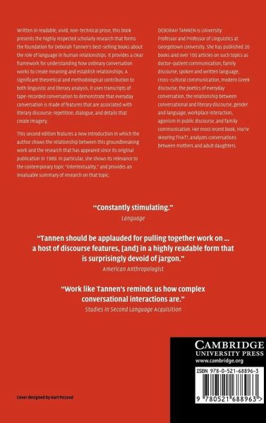 Written in readable, vivid, non-technical prose, this book presents the highly respected scholarly research that forms the foundation for Deborah Tannen's best-selling books about the role of language in human relationships. It provides a clear framework for understanding how ordinary conversation works to create meaning and establish relationships. A significant theoretical and methodological contribution to both linguistic and literary analysis, it uses transcripts of tape-recorded conversation to demonstrate that everyday conversation is made of features that are associated with literary discourse: repetition, dialogue, and details that create imagery. This second edition features a new introduction in which the author shows the relationship between this groundbreaking work and the research that has appeared since its original publication in 1989. In particular, she shows its relevance to the contemporary topic 'intertextuality', and provides a useful summary of research on that topic.
