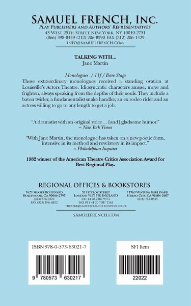 Monologues Jane Martin Characters: 11 female Bare Stage. These extraordinary monologues received a standing ovation at Louisville's Actors Theatre. Idiosyncratic characters amuse, move and frighten, always speaking from the depths of their souls. They include a baton twirler, a fundamentalist snake handler, an ex rodeo rider and an actress willing to go to any length to get a job. 1982 winner of the American Theatre Critics Association Award for Best Regional Play