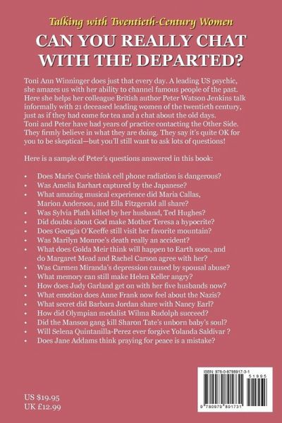 Talking with Twentieth Century Women is not a history book, although the 21 famous women interviewed in it all died last century. Now they take part in live discussions between their souls on the Other Side and the author, Peter Watson Jenkins. The dialogue is channeled by America's foremost Clear Channel psychic, Toni Ann Winninger. The book's intriguing list of women is impressive: Jane Addams, Marian Anderson, Maria Callas, Rachel Carson, Marie Curie, Amelia Earhart, Ella Fitzgerald, Anne Frank, Judy Garland, Barbara Jordan, Helen Keller, Margaret Mead, Golda Meir, Carmen Miranda, Marilyn Monroe, Georgia O Keeffe, Sylvia Plath, Selena Quintanilla-Perez, Mother Teresa, Wilma Rudolph, and Sharon Tate. We learn about Mother Teresa s reaction to public fame and inner doubts; Barbara Jordan reveals that she was the philosopher Plato in a past life; Golda Meir explains how she felt to be Prime Minister during Israel s Six Day War; Anne Frank tells of lost diaries and what finally happened to her in the concentration camp. Ella Fitzgerald is much more than a popular singer. She is a very old soul who was engaged in the early development of music and language in the universe. Sylvia Plath and Judy Garland explain what led up to their committing suicide, and we learn from Marilyn Monroe and Maria Callas whether they died accidentally or were murdered. We learn how Helen Keller and Wilma Rudolph felt about their severe disabilities, and discovered what really happened to pioneering aviator Amelia Earhart. And there s much more besides. Second in the series of Dialogues with Masters of the Spirit World this lively and challenging study raises important questions of life and death and after death, with the help of 21 fascinating women who know all the answers now they are back home.