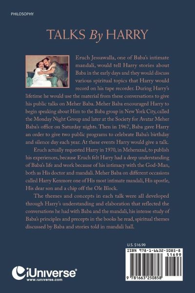 Eruch Jessawalla, one of Baba's intimate mandali, would tell Harry stories about Baba in the early days and they would discuss various spiritual topics that Harry would record on his tape recorder. During Harry's lifetime he would use the material from these conversations to give his public talks on Meher Baba. Meher Baba encouraged Harry to begin speaking about Him to the Baba group in New York City, called the Monday Night Group and later at the Society for Avatar Meher Baba's office on Saturday nights. Then in 1967, Baba gave Harry an order to give two public programs to celebrate Baba's birthday and silence day each year. At these events Harry would give a talk. Eruch actually requested Harry in 1970, in Meherazad, to publish his experiences, because Eruch felt Harry had a deep understanding of Baba's life and work because of his intimacy with the God-Man, both as His doctor and mandali. Meher Baba on different occasions called Harry Kenmore one of His most intimate mandali, His apostle, His dear son and a chip off the Ole Block. The themes and concepts in each talk were all developed through Harry's understanding and elaboration that reflected the conversations he had with Baba and the mandali, his intense study of Baba's principles and precepts in the books he read, spiritual themes discussed by Baba and stories told in mandali hall.