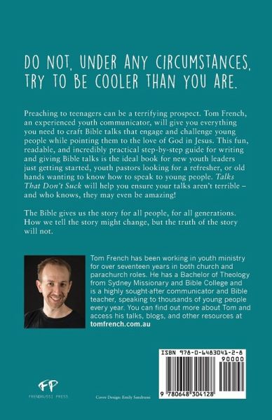 'Do not, under any circumstances, try to be cooler than you are.' Preaching to teenagers can be a terrifying prospect. Tom French, an experienced youth communicator, will give you everything you need to craft Bible talks that engage and challenge young people while pointing them to the love of God in Jesus. This fun, readable, and incredibly practical step-by-step guide for writing and giving Bible talks is the ideal book for new youth leaders just getting started, youth pastors looking for a refresher, or old hands wanting to know how to speak to young people. Talks That Don't Suck will help you ensure your talks aren't terrible -and who knows, they may even be amazing! The Bible gives us the story for all people, for all generations. How we tell the story might change, but the truth of the story will not.