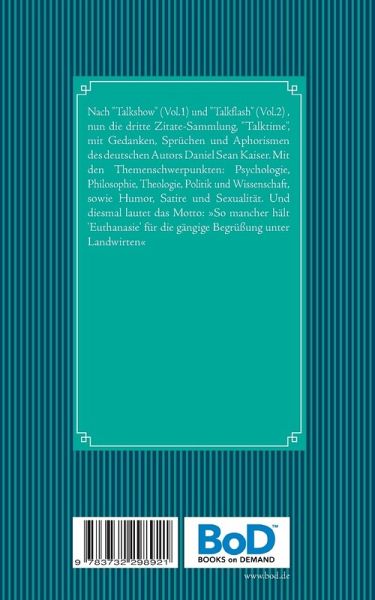Nach "Talkshow" (Vol.1) und "Talkflash" (Vol.2) , nun die dritte Zitate-Sammlung, "Talktime", mit Gedanken, Sprüchen und Aphorismen des deutschen Autors Daniel Sean Kaiser. Mit den Themenschwerpunkten: Psychologie, Philosophie, Theologie, Politik und Wissenschaft, sowie Humor, Satire und Sexualität. Und diesmal lautet das Motto: »So mancher hält 'Euthanasie' für die gängige Begrüßung unter Landwirten«
