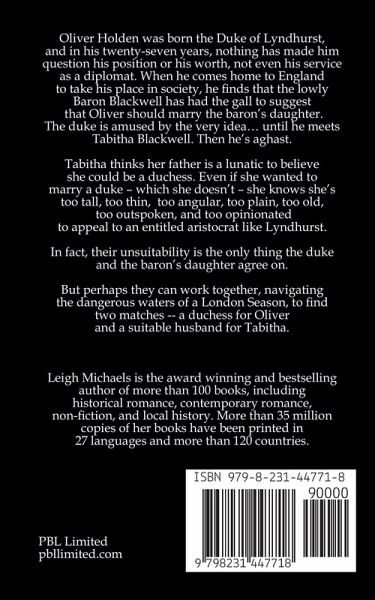 Oliver Holden was born the Duke of Lyndhurst, and in his twenty-seven years, nothing has made him question his position or his worth, not even his service as a diplomat. When he comes home to England to take his place in society, he finds that the lowly Baron Blackwell has had the gall to suggest that Oliver should marry the baron's daughter. The duke is amused by the very idea... until he meets Tabitha Blackwell. Then he's aghast. Tabitha thinks her father is a lunatic to believe she could be a duchess. Even if she wanted to marry a duke - which she doesn't - she knows she's too tall, too thin, too angular, too plain, too old, too outspoken, and too opinionated to appeal to an entitled aristocrat like Lyndhurst. In fact, their unsuitability is the only thing the duke and the baron's daughter agree on. But perhaps they can work together, navigating the dangerous waters of the London Season, to find two matches -- a duchess for Oliver and a suitable husband for Tabitha. Leigh Michaels is the author of more than 100 books, including historical romance, contemporary romance, non-fiction, and local history. More than 35 million copies of her books have been printed in 27 languages and more than 120 countries.