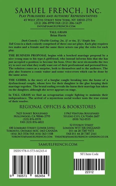 Dark Comedy / Flexible Casting; 2m, 1f or 6m, 3f / Simple Sets Tall Grass is a dark comedy comprised of three one-act plays. Each play requires two males and a female and the same three actors can play the roles for each play. THE BUSINESS PROPOSAL begins with a botched marriage proposal by a nice young man to his type-A girlfriend, who instead informs him that she has just accepted a position to become his boss. Over the next six-months the two try to sort out what they really want out of their professional and personal lives. The solution comes as a surprise, both to themselves and to the audience. The play also features a comic waiter and some voice-overs which can be done by the same actor. THE GERBIL is the story of a burglar caught breaking into the home of a dysfunctional couple, whose love for their daughter is the glue keeping their marriage together. The brutal ending reveals the harm their marriage has taken on the daughter, although she never appears on stage. In TALL GRASS we find an octogenarian couple fighting to maintain their independence. The arrival of a mysterious social worker tests the true extent of their resolve.