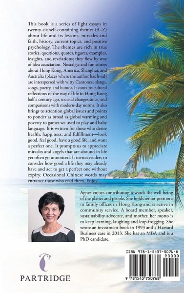This book is a series of light essays in twenty-six self-containing themes (A-Z) about life and its lessons, miracles and faith, history, current topics, and positive psychology. The themes are rich in true stories, questions, quotes, figures, examples, insights, and revelations; they flow by way of idea association. Nostalgic and fun stories about Hong Kong, America, Shanghai, and Australia (places where the author has lived) are interspersed with witty Cantonese slangs, songs, poetry, and humor. It contains cultural reflections of the way of life in Hong Kong half a century ago, societal changes since, and comparisons with modern-day norms. It also brings to attention global issues and points to ponder as broad as global warming and poverty to games we used to play and baby language. It is written for those who desire health, happiness, and fulfillment-look good, feel good, have a good life, and want a perfect one. It prompts us to appreciate miracles and angels that are abound in life yet often go unnoticed. It invites readers to consider how good a life they may already have and act to get a perfect one without expiry. Occasional Chinese words may entrance those who read them. Enjoy!