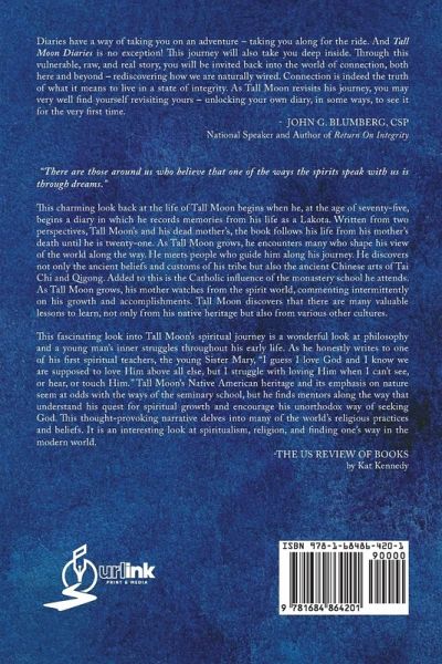 "There are those around us who believe that one of the ways the spirits speak with us is through dreams." This charming look back at the life of Tall Moon begins when he, at the age of seventy-five, begins a diary in which he records memories from his life as a Lakota. Written from two perspectives, Tall Moon's and his dead mother's, the book follows his life from his mother's death until he is twenty-one. As Tall Moon grows, he encounters many who shape his view of the world along the way. He meets people who guide him along his journey. He discovers not only the ancient beliefs and customs of his tribe but also the ancient Chinese arts of Tai Chi and Qigong. Added to this is the Catholic influence of the monastery school he attends. As Tall Moon grows, his mother watches from the spirit world, commenting intermittently on his growth and accomplishments. Tall Moon discovers that there are many valuable lessons to learn, not only from his native heritage but also from various other cultures. This fascinating look into Tall Moon's spiritual journey is a wonderful look at philosophy and a young man's inner struggles throughout his early life. As he honestly writes to one of his first spiritual teachers, the young Sister Mary, "I guess I love God and I know we are supposed to love Him above all else, but I struggle with loving Him when I can't see, or hear, or touch Him." Tall Moon's Native American heritage and its emphasis on nature seem at odds with the ways of the seminary school, but he finds mentors along the way that understand his quest for spiritual growth and encourage his unorthodox way of seeking God. This thought-provoking narrative delves into many of the world's religious practices and beliefs. It is an interesting look at spiritualism, religion, and finding one's way in the modern world. -THE US REVIEW OF BOOKS by Kat Kennedy