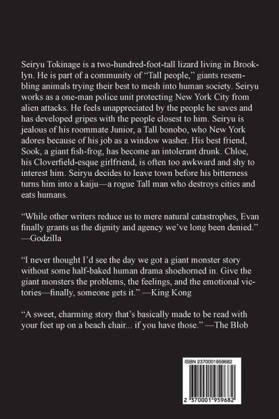 Seiryu Tokinage is a two-hundred-foot-tall lizard living in Brooklyn. He is part of a community of "Tall people," giants resembling animals trying their best to mesh into human society. Seiryu works as a one-man police unit protecting New York City from alien attacks. He feels unappreciated by the people he saves and has developed gripes with the people closest to him. Seiryu is jealous of his roommate Junior, a Tall bonobo, who New York adores because of his job as a window washer. His best friend, Sook, a giant fish-frog, has become an intolerant drunk. Chloe, his Cloverfield-esque girlfriend, is often too awkward and shy to interest him. Seiryu decides to leave town before his bitterness turns him into a kaiju-a rogue Tall man who destroys cities and eats humans. "While other writers reduce us to mere natural catastrophes, Evan finally grants us the dignity and agency we've long been denied." -Godzilla "I never thought I'd see the day we got a giant monster story without some half-baked human drama shoehorned in. Give the giant monsters the problems, the feelings, and the emotional victories-finally, someone gets it." -King Kong "A sweet, charming story that's basically made to be read with your feet up on a beach chair... if you have those." -The Blob