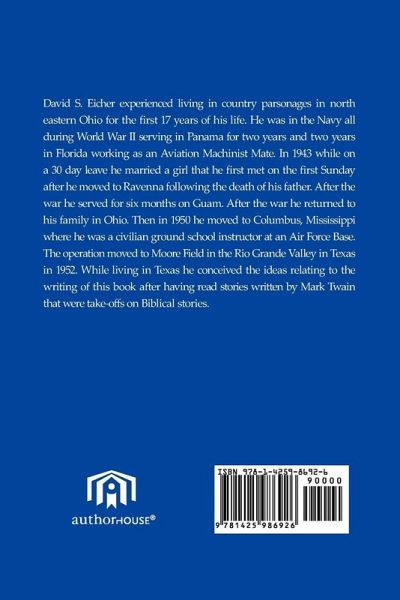 David S. Eicher experienced living in country parsonages in north eastern Ohio for the first 17 years of his life. He was in the Navy all during World War II serving in Panama for two years and two years in Florida working as an Aviation Machinist Mate. In 1943 while on a 30 day leave he married a girl that he first met on the first Sunday after he moved to Ravenna following the death of his father. After the war he served for six months on Guam. After the war he returned to his family in Ohio. Then in 1950 he moved to Columbus, Mississippi where he was a civilian ground school instructor at an Air Force Base. The operation moved to Moore Field in the Rio Grande Valley in Texas in 1952. While living in Texas he conceived the ideas relating to the writing of this book after having read stories written by Mark Twain that were take-offs on Biblical stories.