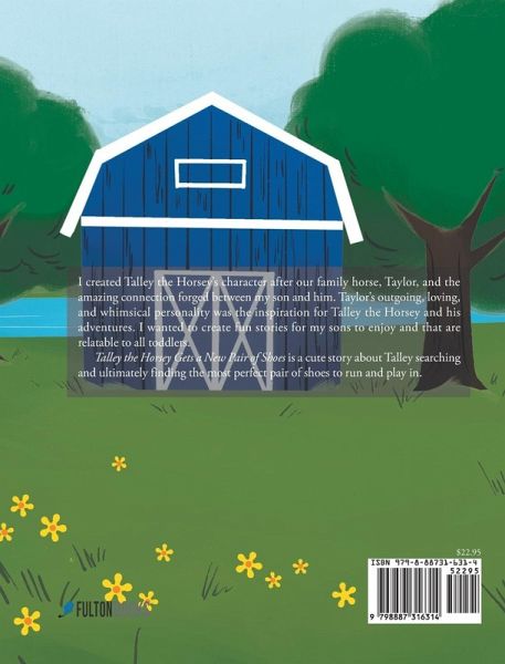I created Talley the Horsey's character after our family horse, Taylor, and the amazing connection forged between my son and him. Taylor's outgoing, loving, and whimsical personality was the inspiration for Talley the Horsey and his adventures. I wanted to create fun stories for my sons to enjoy and that are relatable to all toddlers.Talley the Horsey Gets a New Pair of Shoes is a cute story about Talley searching and ultimately finding the most perfect pair of shoes to run and play in.