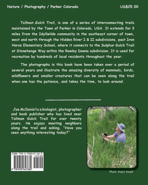 Tallman Gulch Trail, is one of a series of interconnecting trails maintained by the Town of Parker in Colorado, USA. It extends for 3 miles from the Idyllwilde community in the southeast corner of town, west and north through the Hidden River I & II subdivisions, past Iron Horse Elementary School, where it connects to the Sulphur Gulch Trail at Stonehenge Way within the Rowley Downs subdivision. It is used for recreation by hundreds of local residents throughout the year. The photographs in this book have been taken over a period of several years and illustrate the amazing diversity of mammals, birds, wildflowers and smaller creatures that can be seen along the trail when one has the patience, and takes the time, to look around.