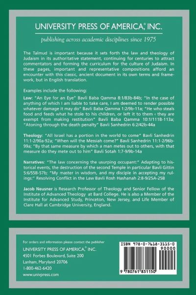 The Talmud is important because it sets forth the law and theology of Judaism in its authoritative statement, continuing for centuries to attract commentators, and forming the curriculum for the culture of Judaism. In these pages, important and representative compositions afford an encounter with this classic, ancient document in its own terms and framework, but in English translation.