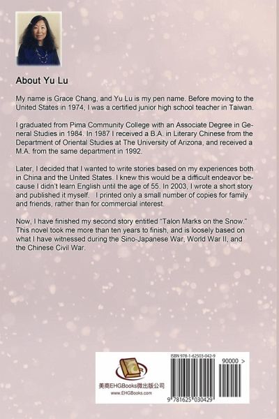 The book tells the story of Chia family, and the traditional ceremonies that accompany marriage, death, and birth. The family's peaceful life is up-ended with the Japanese invasion and the family flees to the countryside. As the country falls into turmoil, the household head, Chia Hao-tz'u is kidnapped. The family's burdens fall on the shoulders of his wife, Tu Hua. After the long war ends, civil war breaks out. The Communists take over the mainland and confiscate the family's property. Tu Hua makes her way south to her youngest daughter Chia Chen's home. Together, they fly to Taiwan. Tu Hua lives on the island for several decades. She returns to the mainland to her older daughter Chia Wei's home. This title is author's second story and it took author more than ten years to finish, and is loosely based on author family's experiences during the Chinese civil war and World War II. My name is Grace Chang, and Yu Lu is my pen name. Before moving to the United States in 1974, I was a certified junior high school teacher in Taiwan. I graduated from Pima Community College with an Associate Degree in General Studies in 1984. In 1987 I received a B.A. in Literary Chinese from the Department of Oriental Studies at The University of Arizona, and received a M.A. from the same department in 1992. Later, I decided that I wanted to write stories based on my experiences both in China and the United States. I knew this would be a difficult endeavor because I did not learn English until the age of 55. In 2003, I wrote a short story and published it myself. I produced only a small number of copies for family and friends, rather than for commercial interest. Now, I have finished my second story entitled "Talon Marks on the Snow." This novel took me more than ten years to finish, and is loosely based on my family's experiences during the Chinese civil war and World War II.