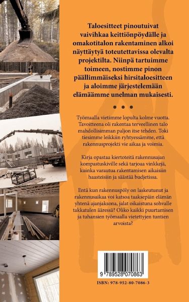 Taloesitteet pinoutuivat vaivihkaa keittiönpöydälle ja omakotitalon rakentaminen alkoi näyttäytyä toteutettavissa olevalta projektilta. Niinpä tartuimme toimeen, nostimme pinon päällimmäiseksi hirsitaloesitteen ja aloimme järjestelemään elämäämme unelman mukaisesti. Työmaalla vietettiin lopulta kolme vuotta. Tavoitteena oli rakentaa terveellinen talo mahdollisimman paljon itse tehden. Toki leikkiin ryhtyessä oli tiedossa, että rakennusprojekti vie aikaa ja voimia. Kirja opastaa kiertoteitä rakennusajan kompastuskiville sekä tarjoaa vinkkejä, kuinka varautua rakentamisen aikaisiin haasteisiin ja säästää budjetissa. Entä kun rakennuspöly on laskeutunut ja rakennusaikaa voi katsoa taaksepäin elämän yhtenä ajanjaksona, jalat oikaistuna sohvalle takkatulen ääressä? Oliko kaikki puurtamisen ja tuhansien työmaalla vietettyjen tuntien arvoista?