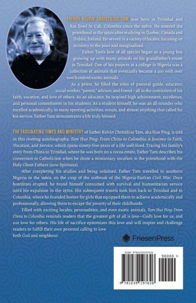 THE FASCINATING TIMES AND MINISTRY of Father Kelvin Christilius Tam, aka Hue Ping, is told in this riveting autobiography, Tam Hue Ping: From China to Colombia: A Journey in Faith, Vocation, and Service, which spans ninety-five years of a life well-lived. Tracing his family's story from China to Trinidad, where he was born on a cocoa estate, Father Tam describes his conversion to Catholicism when he chose a missionary vocation in the priesthood with the Holy Ghost Fathers (now Spiritans). After completing his studies and being ordained, Father Tam travelled to southern Nigeria in the 1960s, on the cusp of the outbreak of the Nigeria-Biafran Civil War. Once hostilities erupted, he found himself consumed with survival and humanitarian service until his expulsion in the 1970s. His subsequent travels took him back to Trinidad and to Colombia, where he founded homes for girls that equipped them to achieve academically and professionally, allowing them to escape the poverty of their childhoods. Filled with exciting locales, personalities, and even exotic animals, Tam Hue Ping: From China to Columbia reminds readers that the greatest gift of all is love-God's love for us, and our love for others. His life of sacrifice epitomizes this love and will inspire and challenge readers to fulfill their own personal calling to love both God and neighbour.