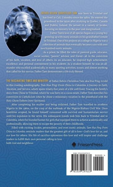 THE FASCINATING TIMES AND MINISTRY of Father Kelvin Christilius Tam, aka Hue Ping, is told in this riveting autobiography, Tam Hue Ping: From China to Colombia: A Journey in Faith, Vocation, and Service, which spans ninety-five years of a life well-lived. Tracing his family's story from China to Trinidad, where he was born on a cocoa estate, Father Tam describes his conversion to Catholicism when he chose a missionary vocation in the priesthood with the Holy Ghost Fathers (now Spiritans). After completing his studies and being ordained, Father Tam travelled to southern Nigeria in the 1960s, on the cusp of the outbreak of the Nigeria-Biafran Civil War. Once hostilities erupted, he found himself consumed with survival and humanitarian service until his expulsion in the 1970s. His subsequent travels took him back to Trinidad and to Colombia, where he founded homes for girls that equipped them to achieve academically and professionally, allowing them to escape the poverty of their childhoods. Filled with exciting locales, personalities, and even exotic animals, Tam Hue Ping: From China to Columbia reminds readers that the greatest gift of all is love-God's love for us, and our love for others. His life of sacrifice epitomizes this love and will inspire and challenge readers to fulfill their own personal calling to love both God and neighbour.