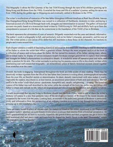 This biography is about the life's journey of the late TAM Kwong through the eyes of his children growing up in Hong Kong and Brisbane from the 1960s. It entailed the times and life of a seafarer's journey sailing the seven sea from 1940s during the golden age in Shipping era and eventually settled in Brisbane in the 1970s. The writer's recollections of memories of his late father throughout different timelines at Pearl Sea (Zhuhai, Sanzao Dao,Guangzhou)/Hong Kong/Brisbane was turned to a collection of flashbacks, moments in time, portraying a historical account of a life lived through hard work, struggles and determination to succeed. The gallery of historical account was partly based on a manuscripts hand written by TAM Kwong in 1965 and skillfully built up to form the comprehensive account of a life that set the cornerstone to the foundation of the TAM's Clan in Brisbane. The book represents the culmination of years of research. Diligently researched over the years and densely informative. The author's work is a biography in full, and particularly rich on his father's character, personality, and his way of life. The writer paints a vast canvas of his father but still maintains a sharp focus on his character, his reactions to people and events around him. Each chapter contains a wealth of fascinating historical Information. It is especially touching to read his description of his father to whom the writer here offers a gracious tribute. Perhaps the most poignant section of the book is a collection of essays and reviews about his father. He has turned his memory of his father, among many others, into a virtual reality by display of various miniature models for those younger generations to capture their interest and brought his father's characteristic in exhaustive details. A wonderful sense of narrative pace and style, and surely a passion for his aim .The writer succeeds in portraying his parents come to life in this clearly written while entertaining and well-researched biography - an extraordinary piece of family historical account pieced together from scratches over the years. Overall, the book is engaging. Interspersed throughout the book are little asides of easy reading. There may be sensitively written vignettes from the life of his late father that Cameron is writing about, autobiographical episodes from his own life, or fanciful stories or determination. In short, densely intertwined with tales makes it nearly impossible for readers, once drawn in, to lose interest, an uncommon achievement of both style and substance. The real stuff is in the writer's individual pieces - passionate, thoughtful and, usually, enlightening ...riveting. The historical context of his father was well described by the writer while the strength of the book lies in the way he conveys his father's virtues and outlook on life, which are inspirational and educational for his children and progeny to follow. I would recommend that anyone living in Brisbane should read the book if they want to add or share the writer's memory (of course in a less than pedantic way) of the development history of Brisbane in the recent decades as witnessed by the writer over the years. Looking back, an account of the embryonic growth of Brisbane is particularly lively and informative from the perspective of an ordinary resident ever since living through his boyhood and growing up in this wonderful city. There are many model displays of various scale for readers to visualize the scenes mentioned in the chapters and to capture readers' attention on some history events/places to arouse their interest from a historical perspective. As Dad's grandchildren are all born in Australia, hopefully the grandchildren and their progenies can get to know this mild mannered chef and pastry cook and learn how he shaped the family future in the land "Downunder" where "Women glow and Men thunder".