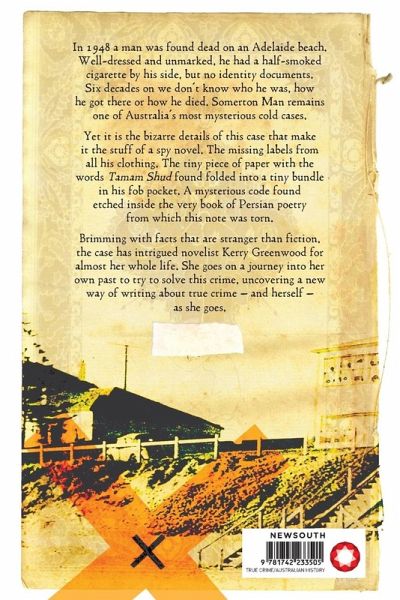 In 1948 a man was found dead on an Adelaide beach. Well-dressed and unmarked, he had a half-smoked cigarette by his side, but no identity documents. Six decades on we don't know who he was, how he got there or how he died. Somerton Man remains one of Australia's most mysterious cold cases. Yet it is the bizarre details of this case that make it the stuff of a spy novel. The missing labels from all his clothing. The tiny piece of paper with the words 'Tamam Shud' found sewn into the lining of the dead man's coat. A mysterious code found etched inside the very book of Persian poetry from which this note was torn. Brimming with facts that are stranger than fiction, the case has intrigued novelist Kerry Greenwood for almost her whole life. She goes on a journey into her own past to try to solve this crime, uncovering a new way of writing about true crime - and herself - as she goes.