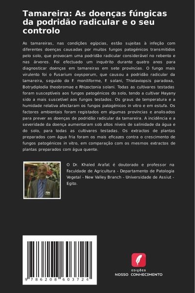 As tamareiras, nas condições egípcias, estão sujeitas à infeção com diferentes doenças causadas por muitos fungos patogénicos transmitidos pelo solo, que provocam uma podridão radicular considerável no rebento e nas árvores. Foi efectuado um inquérito durante quatro anos para diagnosticar doenças em tamareiras em sete províncias. O fungo mais virulento foi o Fusarium oxysporum, que causou a podridão radicular da tamareira, seguido do F. moniliforme, F. solani, Thielaviopsis paradoxa, Botrydiplodia theobromae e Rhizoctonia solani. Todas as cultivares testadas foram susceptíveis aos fungos patogénicos do solo, tendo a cultivar Hayany sido a mais suscetível aos fungos testados. Os graus de temperatura e a humidade relativa afectaram os fungos patogénicos in vitro e em estufa. Os factores ambientais foram registados em algumas províncias e analisados para prever as doenças de podridão radicular da tamareira. A incidência e a severidade da doença aumentaram sob altos níveis de salinidade da água e do solo, para todas as cultivares testadas. Os extractos de plantas preparados com água fria foram os mais eficazes contra o crescimento de fungos patogénicos in vitro, em comparação com os mesmos extractos de plantas preparados com água quente.