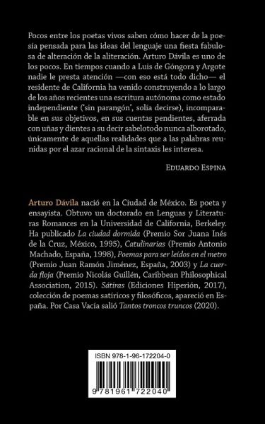 Pocos entre los poetas vivos saben cómo hacer de la poesía pensada para las ideas del lenguaje una fiesta fabulosa de alteración de la aliteración. Arturo Dávila es uno de los pocos. En tiempos cuando a Luis de Góngora y Argote nadie le presta atención -con eso está todo dicho- el residente de California ha venido construyendo a lo largo de los años recientes una escritura autónoma como estado independiente ('sin parangón', solía decirse), incomparable en sus objetivos, en sus cuentas pendientes, aferrada con uñas y dientes a su decir sabelotodo nunca alborotado, únicamente de aquellas realidades que a las palabras reunidas por el azar racional de la sintaxis les interesa. [Eduardo Espina]