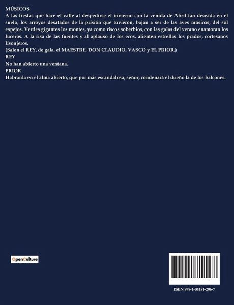 MÚSICOS A las fiestas que hace el valle al despedirse el invierno con la venida de Abril tan deseada en el suelo, los arroyos desatados de la prisión que tuvieron, bajan a ser de las aves músicos, del sol espejos. Verdes gigantes los montes, ya como riscos soberbios, con las galas del verano enamoran los luceros. A la risa de las fuentes y al aplauso de los ecos, alienten estrellas los prados, cortesanos lisonjeros. (Salen el REY, de gala, el MAESTRE, DON CLAUDIO, VASCO y EL PRIOR.) REY No han abierto una ventana. PRIOR Habranla en el alma abierto, que por más escandalosa, señor, condenará el dueño la de los balcones.