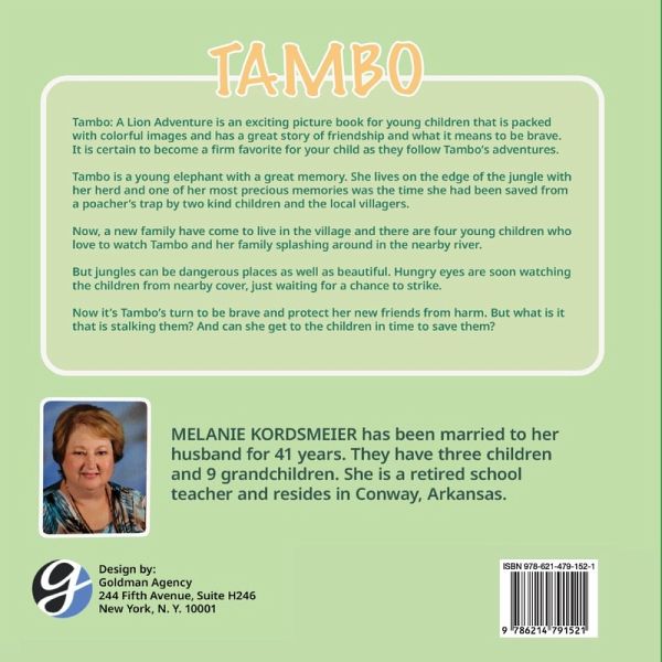 Tambo: A Lion Adventure is an exciting picture book for young children that is packed with colorful images and has a great story of friendship and what it means to be brave. Tambo is a young elephant with a great memory. She lives on the edge of the jungle with her herd and one of her most precious memories was the time she had been saved from a poacher's trap by two kind children and the local villagers. Now, a new family has come to live in the village and there are four young children who love to watch Tambo and her family splashing around in the nearby river. But jungles can be dangerous places as well as beautiful. Hungry eyes are soon watching the children from nearby cover, just waiting for a chance to strike. Now it's Tambo's turn to be brave and protect her new friends from harm. But what is it that is stalking them? And can she get to the children in time to save them?