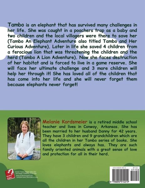 Tambo is an elephant that has survived many challenges in her life. She was caught in a poachers trap as a baby and two children and the local villagers were there to save her (Tambo An Elephant Adventure also titled Tambo and Her Curious Adventure). Later in life she saved 4 children from a ferocious lion that was threatening the children and the herd (Tambo A Lion Adventure). Now she faces destruction of her habitat and is forced to live in a game reserve. She will face her ultimate challenge and 3 more children will help her through it! She has loved all of the children that has come into her life and she will never forget them because elephants never forget!