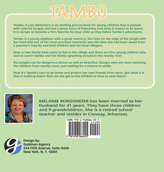 Tambo: A Lion Adventure is an exciting picture book for young children that is packed with colorful images and has a great story of friendship and what it means to be brave. Tambo is a young elephant with a great memory. She lives on the edge of the jungle with her herd and one of her most precious memories was the time she had been saved from a poacher's trap by two kind children and the local villagers. Now, a new family has come to live in the village and there are four young children who love to watch Tambo and her family splashing around in the nearby river. But jungles can be dangerous places as well as beautiful. Hungry eyes are soon watching the children from nearby cover, just waiting for a chance to strike. Now it's Tambo's turn to be brave and protect her new friends from harm. But what is it that is stalking them? And can she get to the children in time to save them?