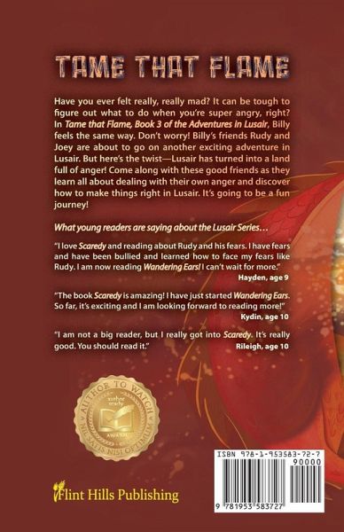 Have you ever felt really, really mad? It can be tough to figure out what to do when you're super angry, right? In Tame that Flame, Book 3 of the Adventures in Lusair, Billy feels the same way. Don't worry! Billy's friends Rudy and Joey are about to go on another exciting adventure in Lusair. But here's the twist-Lusair has turned into a land full of anger! Come along with these good friends as they learn all about dealing with their own anger and discover how to make things right in Lusair. It's going to be a fun journey! What young readers are saying about the Lusair Series... "I love Scaredy and reading about Rudy and his fears. I have fears and have been bullied and learned how to face my fears like Rudy. I am now reading Wondering Ears! I can't wait for more." Hayden, age 9 "The book Scaredy is amazing! I have just started Wandering Ears. So far, it's exciting and I am looking forward to reading more!" Kydin, age 10 "I am not a big reader, but I really got into Scaredy. It's really good. You should read it." Rileigh, age 10