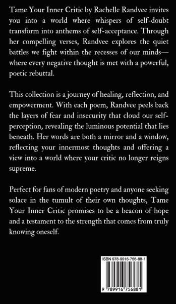 Tame Your Inner Critic by Rachelle Randvee invites you into a world where whispers of self-doubt transform into anthems of self-acceptance. Through her compelling verses, Randvee explores the quiet battles we fight within the recesses of our minds-where every negative thought is met with a powerful, poetic rebuttal. This collection is a journey of healing, reflection, and empowerment. With each poem, Randvee peels back the layers of fear and insecurity that cloud our self-perception, revealing the luminous potential that lies beneath. Her words are both a mirror and a window, reflecting your innermost thoughts and offering a view into a world where your critic no longer reigns supreme. Perfect for fans of modern poetry and anyone seeking solace in the tumult of their own thoughts, Tame Your Inner Critic promises to be a beacon of hope and a testament to the strength that comes from truly knowing oneself. Copyright © 2024 Book Fairy Publishing