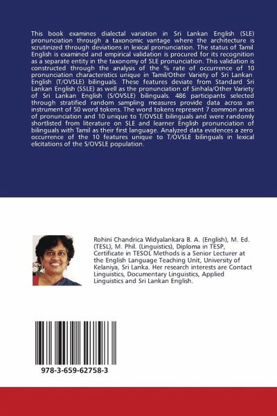 This book examines dialectal variation in Sri Lankan English (SLE) pronunciation through a taxonomic vantage where the architecture is scrutinized through deviations in lexical pronunciation. The status of Tamil English is examined and empirical validation is procured for its recognition as a separate entity in the taxonomy of SLE pronunciation. This validation is constructed through the analysis of the % rate of occurrence of 10 pronunciation characteristics unique in Tamil/Other Variety of Sri Lankan English (T/OVSLE) bilinguals. These features deviate from Standard Sri Lankan English (SSLE) as well as the pronunciation of Sinhala/Other Variety of Sri Lankan English (S/OVSLE) bilinguals. 486 participants selected through stratified random sampling measures provide data across an instrument of 50 word tokens. The word tokens represent 7 common areas of pronunciation and 10 unique to T/OVSLE bilinguals and were randomly shortlisted from literature on SLE and learner English pronunciation of bilinguals with Tamil as their first language. Analyzed data evidences a zero occurrence of the 10 features unique to T/OVSLE bilinguals in lexical elicitations of the S/OVSLE population.