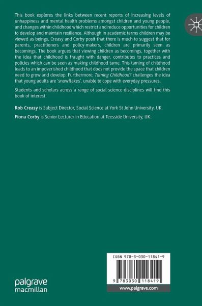 This book explores the links between recent reports of increasing levels of unhappiness and mental health problems amongst children and young people, and changes within childhood which restrict and reduce opportunities for children to develop and maintain resilience. Although in academic terms children may be viewed as beings, Creasy and Corby posit that there is much to suggest that for parents, practitioners and policy-makers, children are primarily seen as becomings. The book argues that viewing children as becomings, together with the idea that childhood is fraught with danger, contributes to practices and policies which can be seen as making childhood tame. This taming of childhood leads to an impoverished childhood that does not provide the space that children need to grow and develop. Furthermore, Taming Childhood? challenges the idea that young adults are 'snowflakes', unable to cope with everyday pressures.
