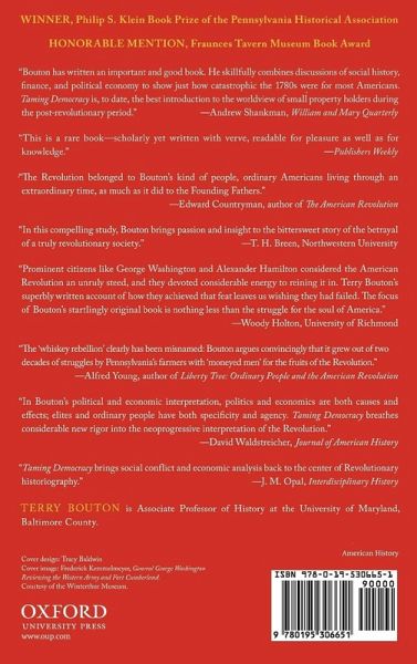 Americans are fond of reflecting upon the Founding Fathers, the noble group of men who came together to force out the tyranny of the British and bring democracy to the land. Unfortunately, as Terry Bouton shows in this highly provocative first book, the Revolutionary elite often seemed as determined to squash democracy after the war as they were to support it before. Centering on Pennsylvania, the symbolic and logistical center of the Revolution, Bouton shows how this radical shift in ideology spelled tragedy for hundreds of common people. Leading up to the Revolution, Pennsylvanians were united in their opinion that "the people" (i.e. white men) should be given access to the political system, and that some degree of wealth equality (i.e. among white men) was required to ensure that political freedom prevailed. As the war ended, Pennsylvania's elites began brushing aside these ideas, using their political power to pass laws to enrich their own estates and hinder political organization by their opponents. By the 1780s, they had reenacted many of the same laws that they had gone to war to abolish, returning Pennsylvania to a state of economic depression and political hegemony. This unhappy situation led directly to the Whiskey and Fries rebellions, popular uprisings both put down by federal armies. Bouton's work reveals a unique perspective, showing intimately how the war and the events that followed affected poor farmers and working people. Bouton introduces us to unsung heroes from this time--farmers, weavers, and tailors who put their lives on hold to fight to save democracy from the forces of "united avarice." We also get a starkly new look at some familiar characters from the Revolution, including Benjamin Franklin, Alexander Hamilton, and George Washington, who Bouton strives to make readers see as real, flawed people, blinded by their own sense of entitlement. Taming Democracy represents a turning point in how we view the outcomes of the Revolutionary War and the motivations of the powerful men who led it. Its eye-opening revelations and insights make it an essential read for all readers with a passion for uncovering the true history of America.